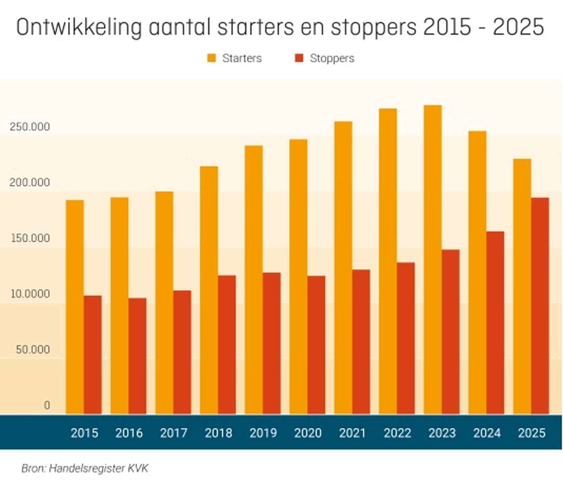 De groei van het aantal vestigingen in Nederland is in 2025 historisch laag uitgekomen. Het totaal aantal vestigingen dat op 1 januari 2026 ingeschreven stond in het Handelsregister van de Kamer van Koophandel (KVK) was 2.599.668. Dat is een toename van slechts 1% ten opzichte van een jaar eerder (2.579.735), de laagste stijging in jaren.